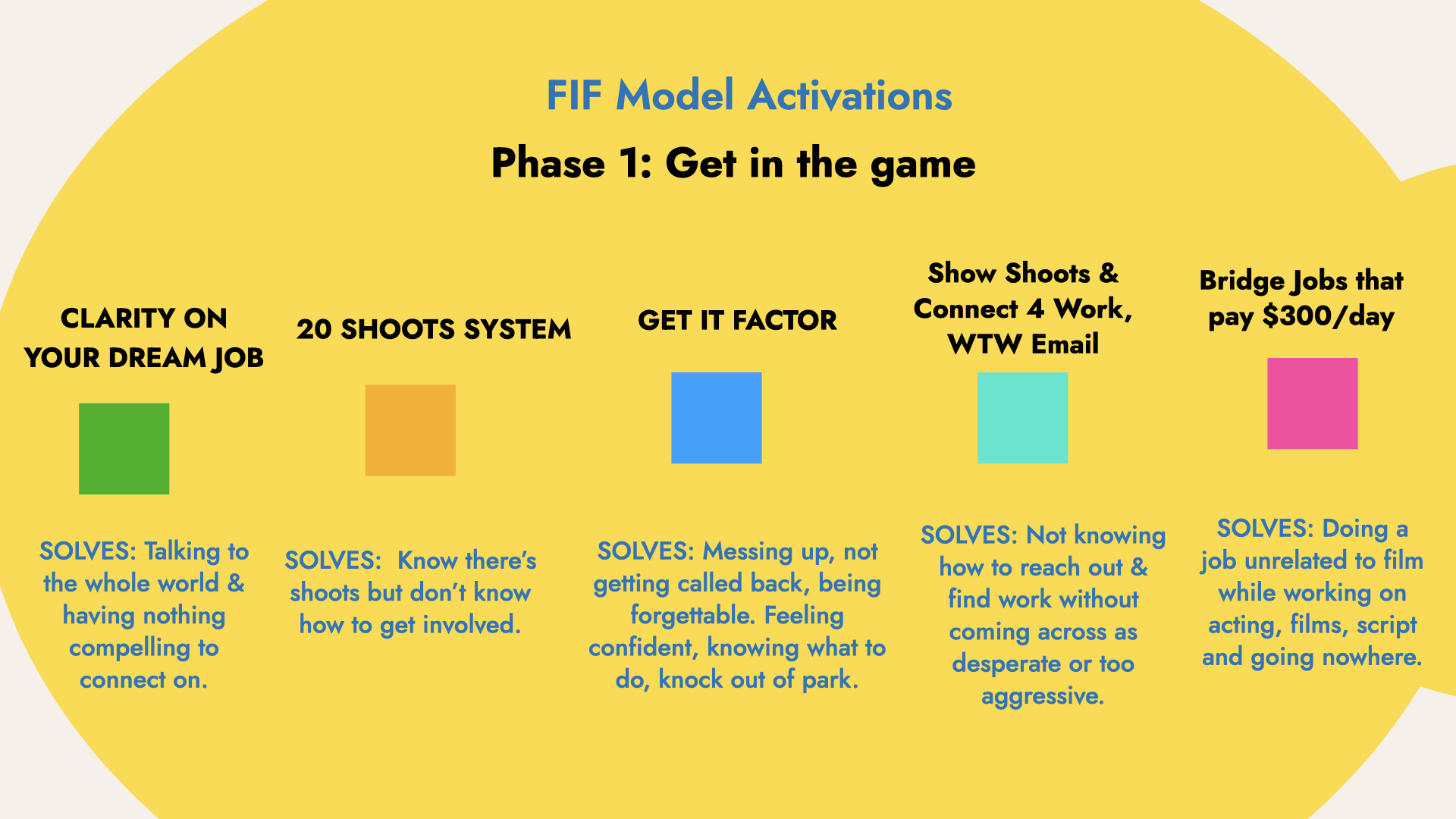 f. The sequence of jobs that make your dream job goal possible. - Getting Bridge Jobs — Use Bridge Jobs so you can pay your bills and build your film career at the same time. Brand Ambassador, Events, Concerts, Experiential marketing, Product Launches.